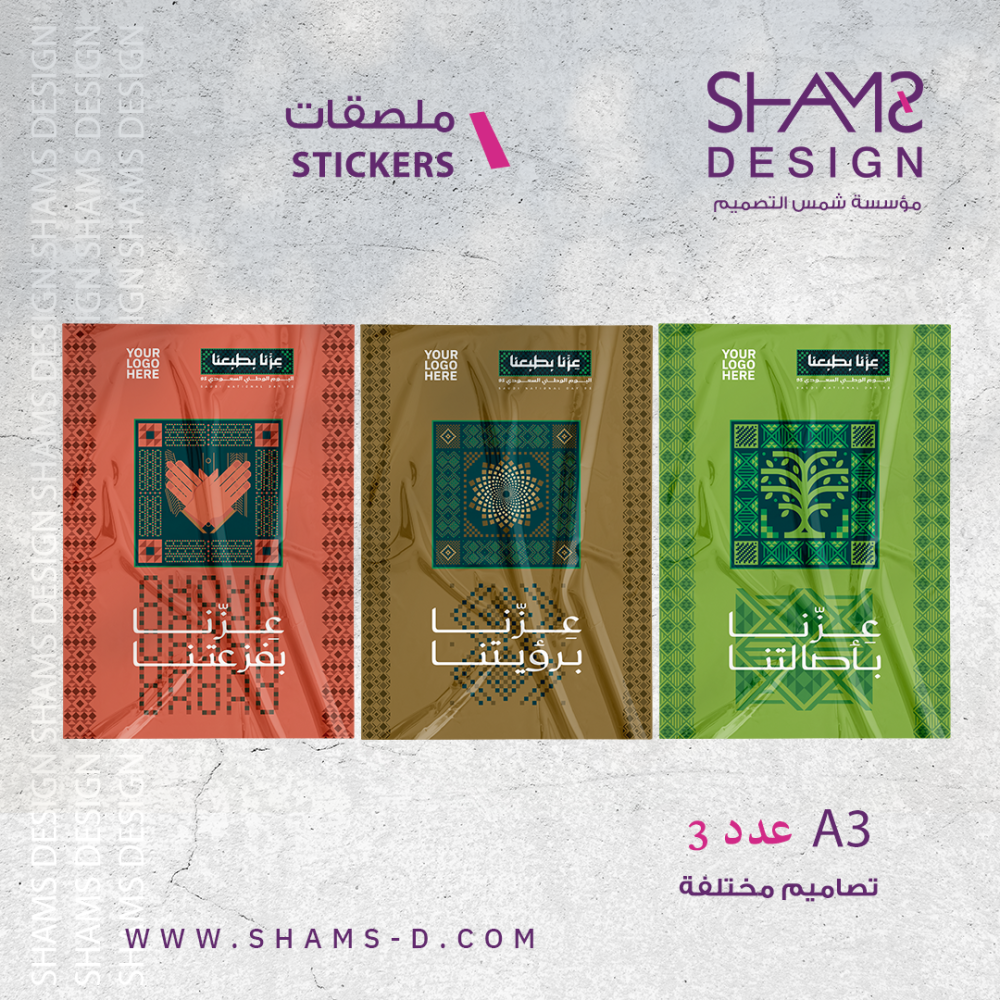 عدد 3 ملصقات بهوية اليوم الوطني 95 بشعار عزنا بطبعنا
